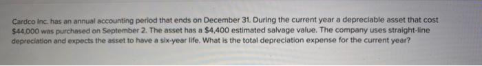 Has an annual accounting period that ends on December 31. During the current year a. During the current year a depreciable asset which cost 42000 was purchased on September 2.